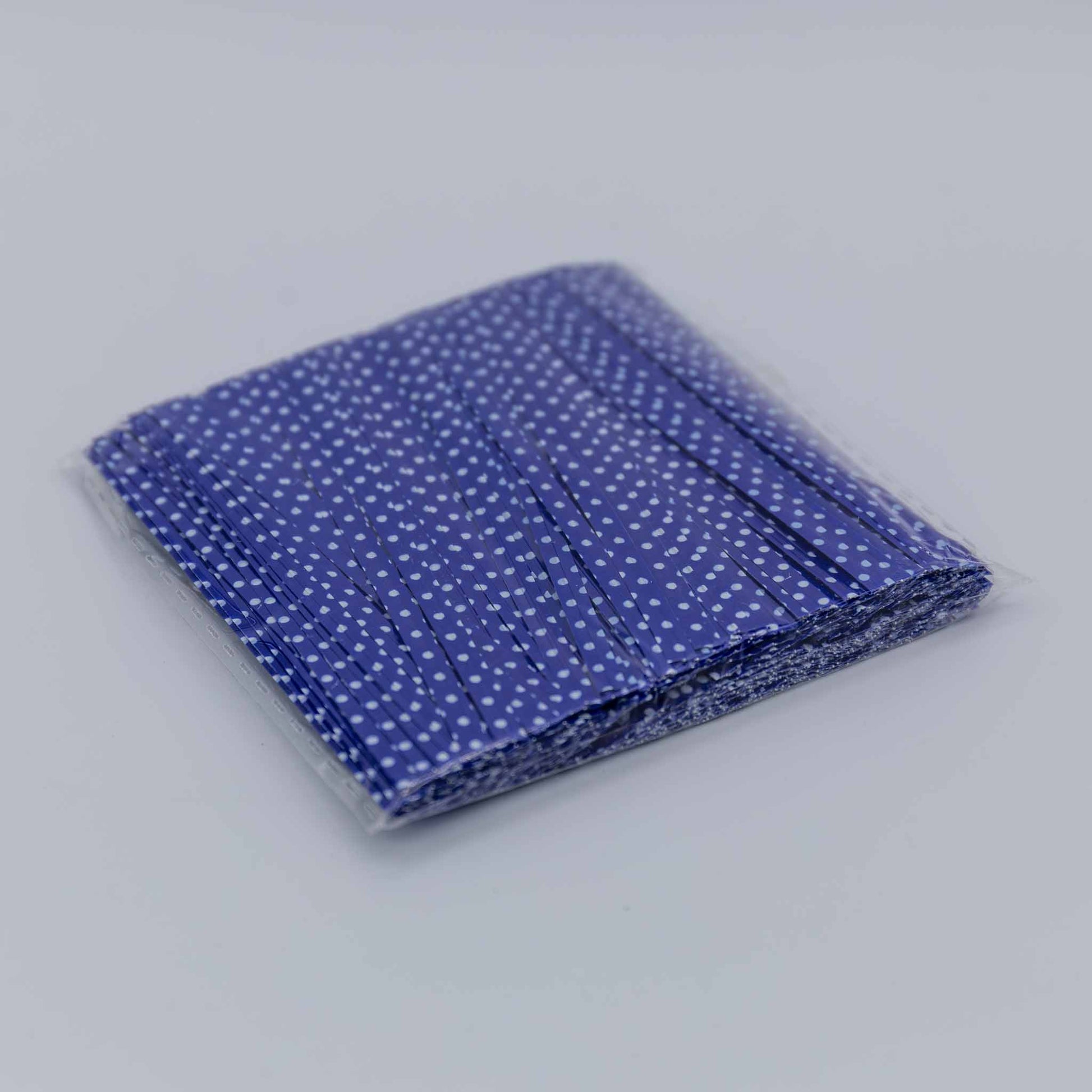These are ideal for closing up the lollipop sucker bags that we also offer. Conveniently sold in a package of 500 twist ties. Blue in color with white polka dots. Approximately 4 inches in length.