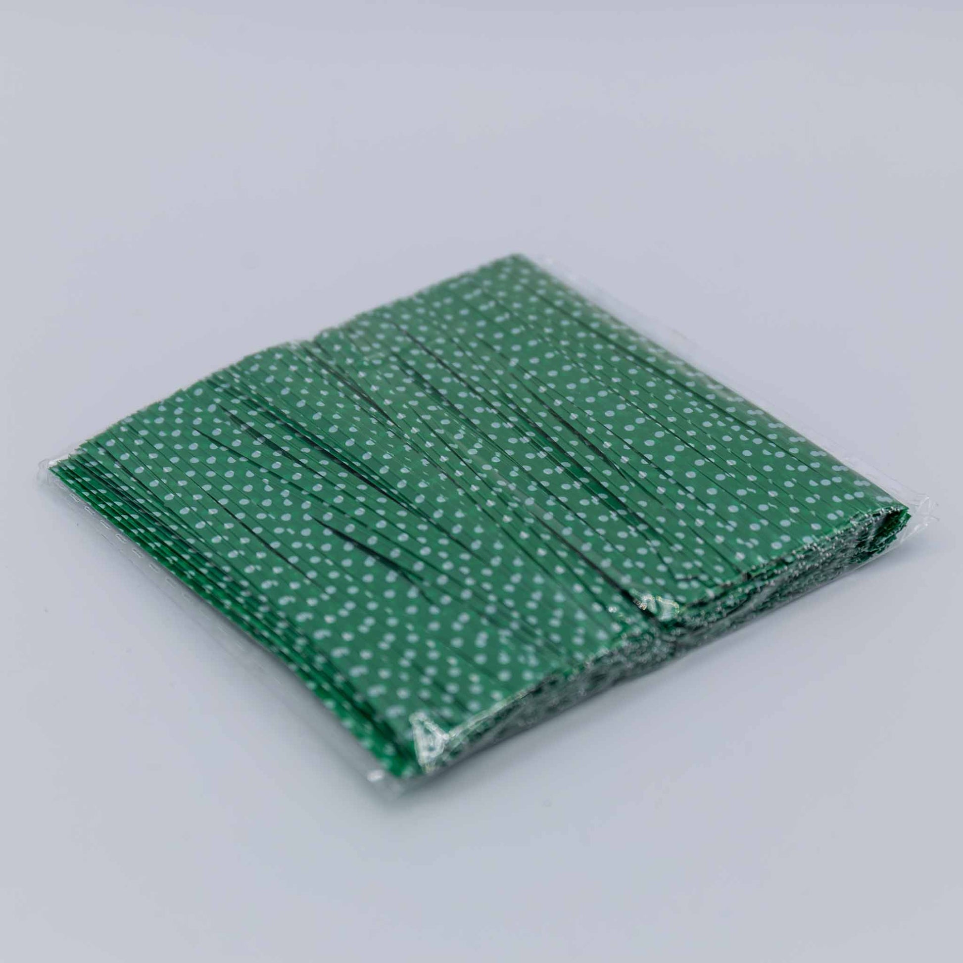 These are ideal for closing up the lollipop sucker bags that we also offer. Conveniently sold in a package of 500 twist ties. Green in color with white polka dots. Approximately 4 inches in length.