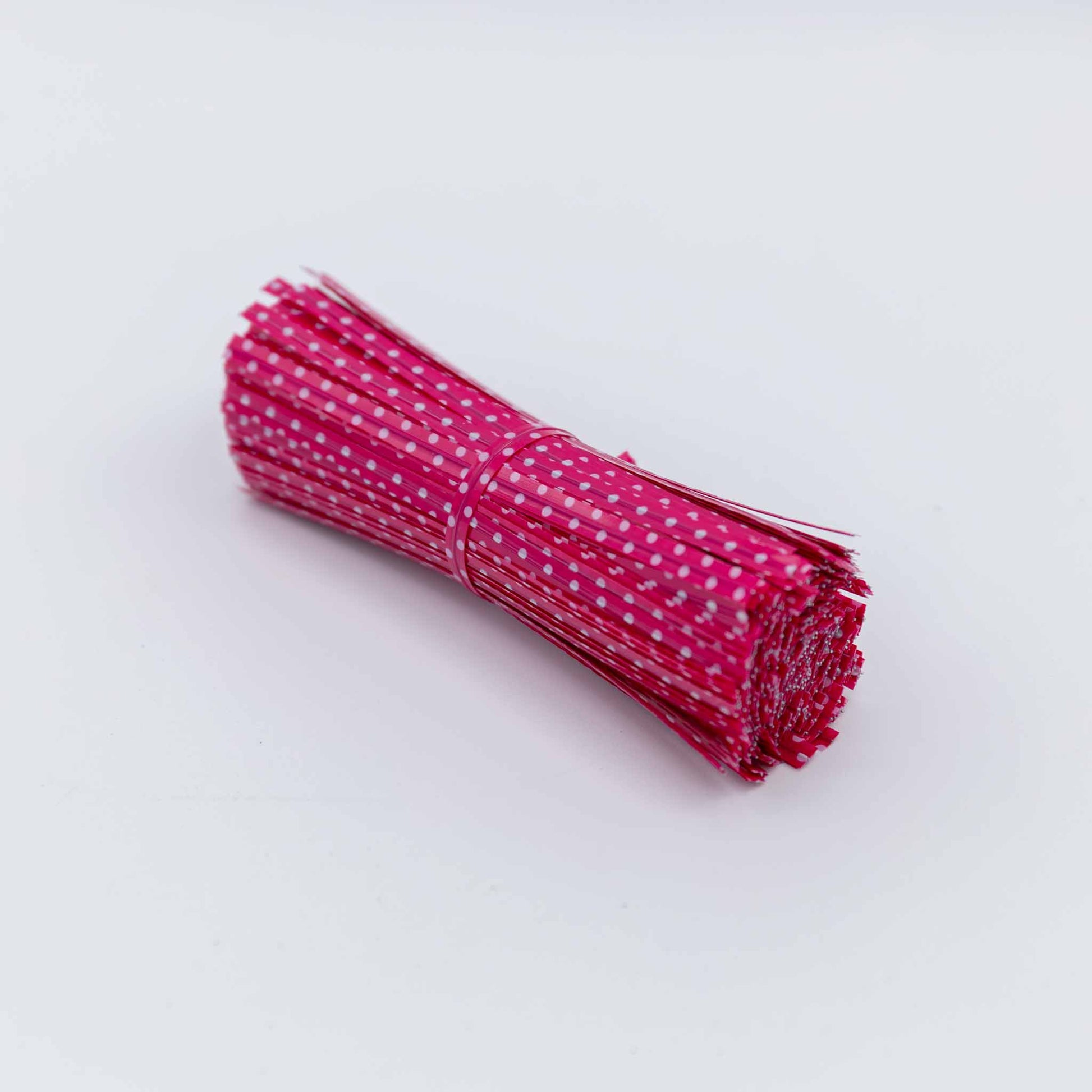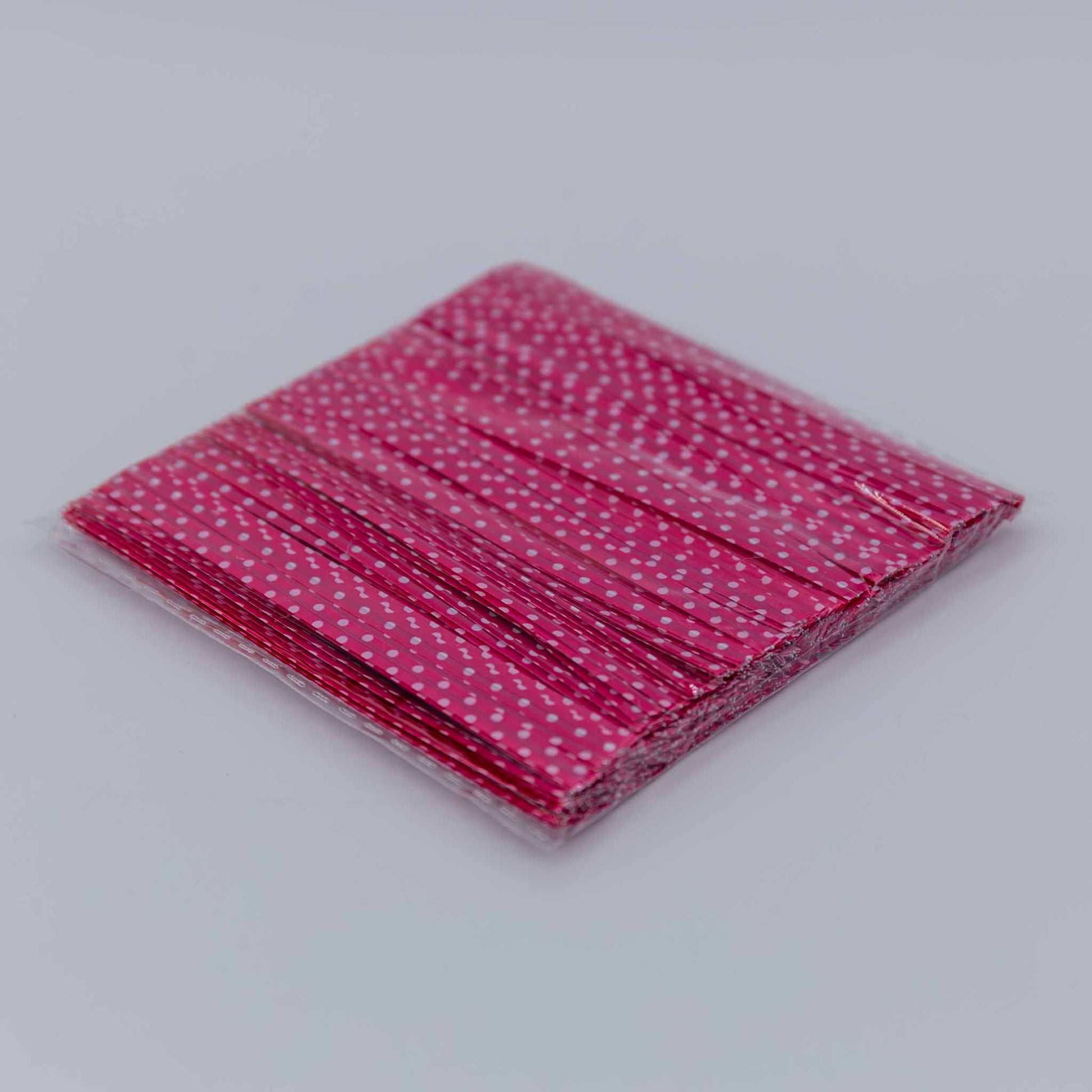 These are ideal for closing up the lollipop sucker bags that we also offer. Conveniently sold in a package of 500 twist ties. Pink in color with white polka dots. Approximately 4 inches in length.